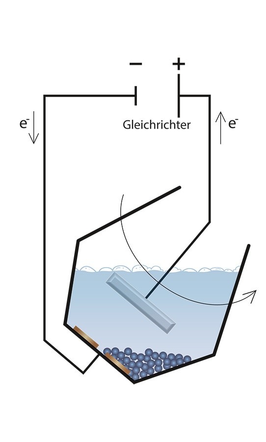 Glockenförmige Behälter zum Galvanisieren von Kleinteilen. Vergleichbar einem Betonmischer wird die Ware ständig durchmischt. Die kathodischen Kontaktknöpfe befinden sich am Boden der Glocke; die Anode wird von oben in den Elektrolyten getaucht.