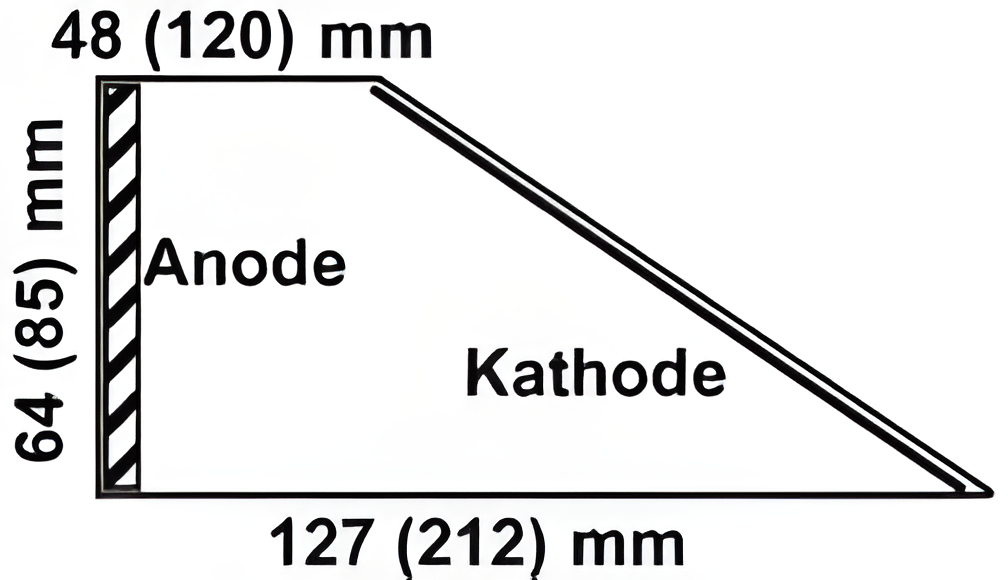 Dabei ist I der angelegte Strom in Ampere und x der Abstand vom schmalen Ende der Kathode in Zentimetern.